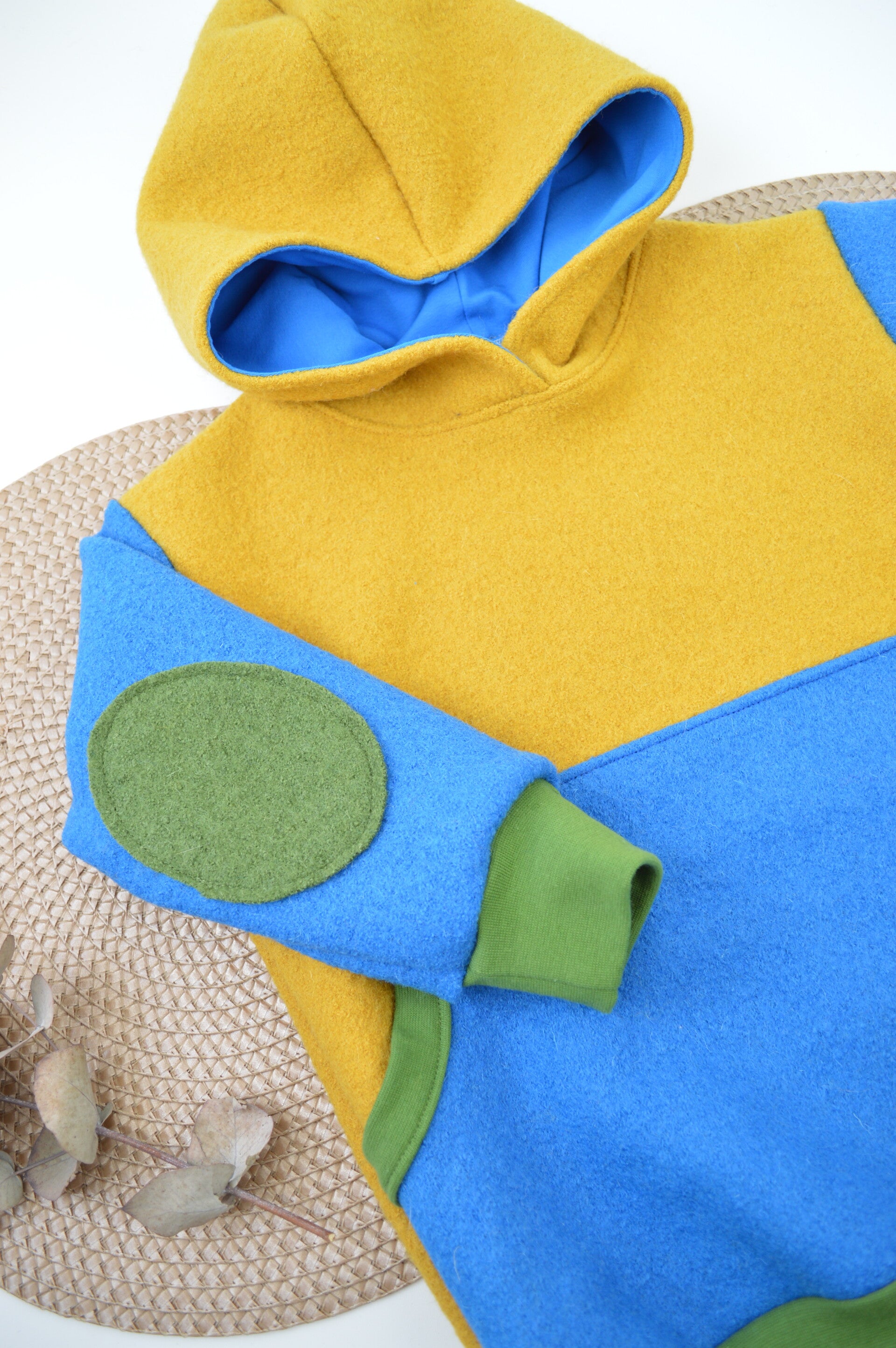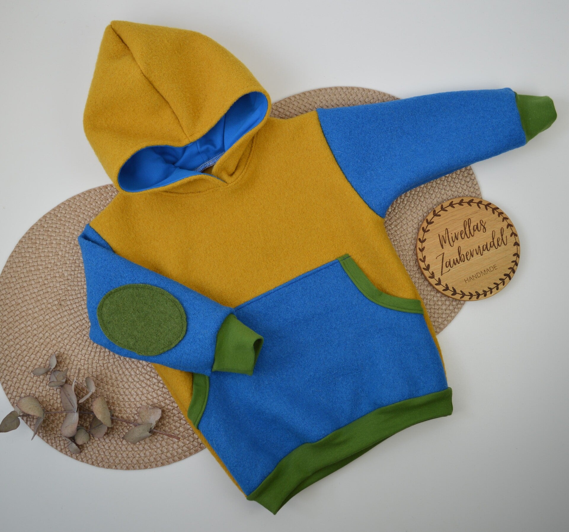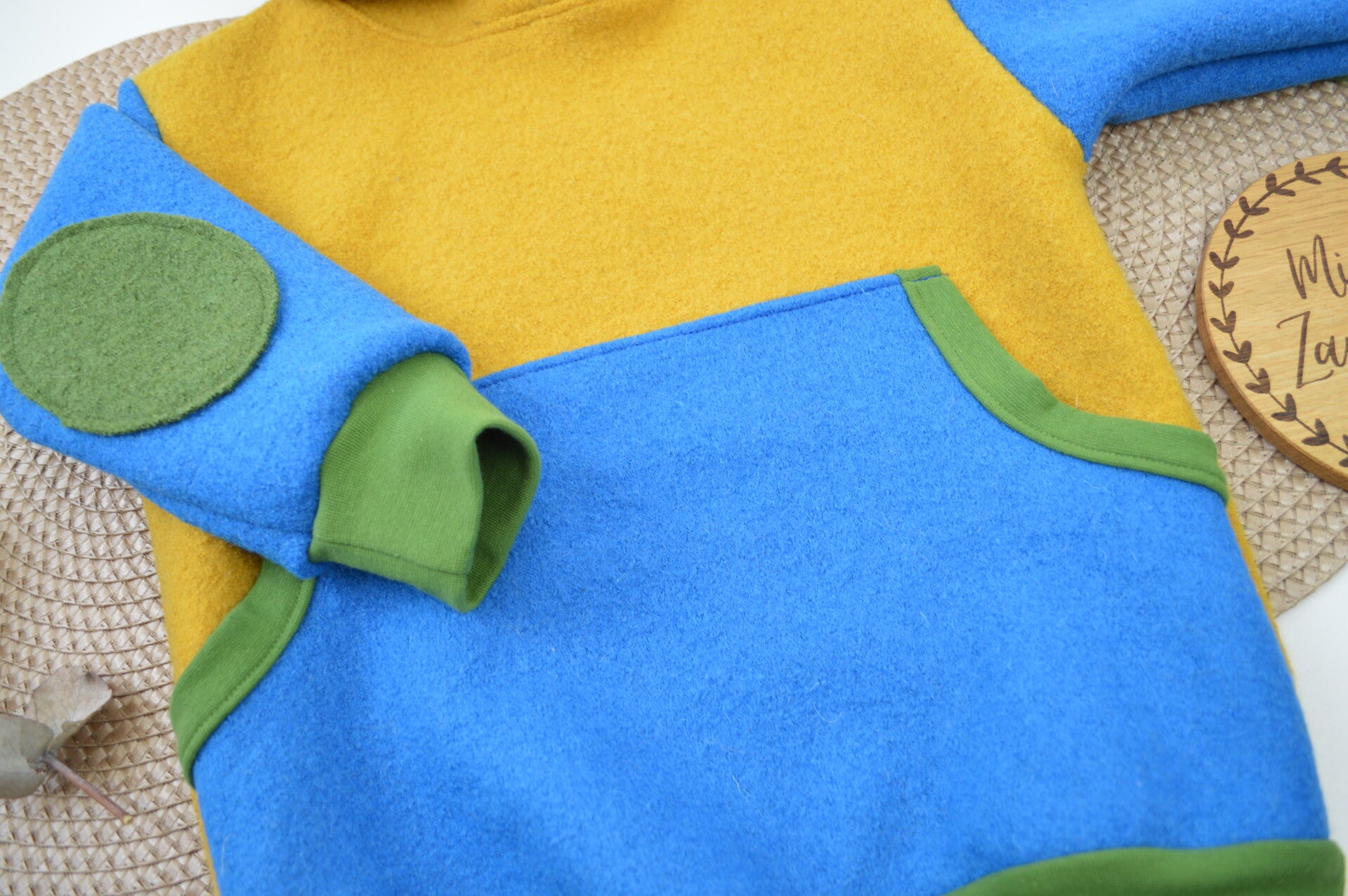 Der bequeme Walkhoodie ist in der Kapuze mit einem weichem Baumwoll-Jersey gefüttert, damit es eure Kinder schön kuschelig haben. Die Bauchtasche (welche optional ist) sieht nicht nur toll aus, sondern ist auch praktisch. Hier können eure kleinen Mäuse gesammelte Fundstücke gleich aufbewahren. Er ist perfekt tragbar von Herbst über den Winter, bis zum Frühlingsende.