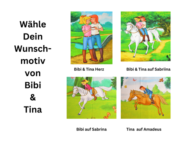 Auf der Vorderseite ist das Wunsch-Panel mit Bibi und Tina und die Rückseite ist aus uni Jerseystoff.