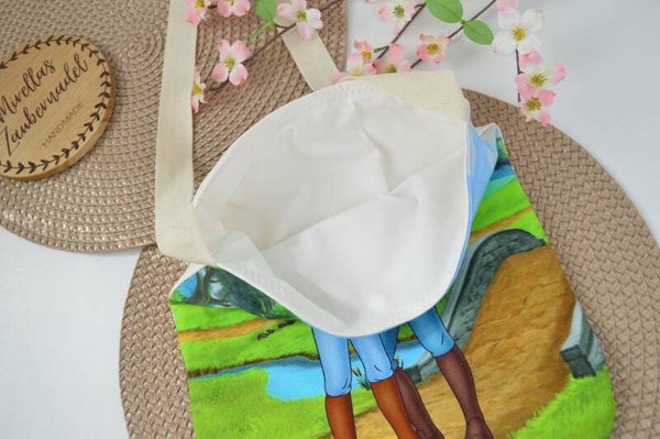 Der Beutel hat eine Höhe von ca. 33 cm und eine Breite von ca. 28 cm. Der Tragegurt aus weicher Baumwolle ist ca. 87 cm lang (von einer zur anderen Seite gemessen).