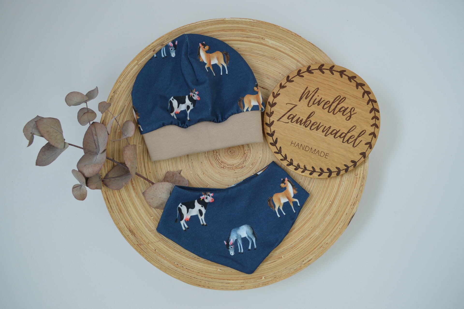 Diese süße Mütze mit Bündchen wird aus Deinem Wunschstoff genäht. Die Mütze ist doppellagig. Passend dazu gibt es dann das Dreickstuch. Dieses wird mit einem Druckknopf geschlossen.