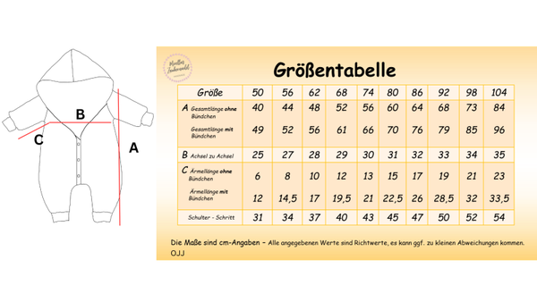 Ein durchgehender Reißverschluss vorn sorgt für einfaches An- und Ausziehen. Die extra langen Mitwachsbündchen an Armen und Beinen bieten bequemen Halt, schließen gegen Zugluft ab und ermöglichen eine längere Tragedauer – der Walkoverall wächst mindestens eine Größe mit!