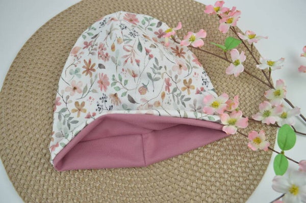 Beanie ist innen komplett doppellagig mit weichem Baumwolljersey gefüttert, sodass dein kleiner Schatz schön warm am Kopf ist. Außen süßer Musterstoff, innen unifarbend.