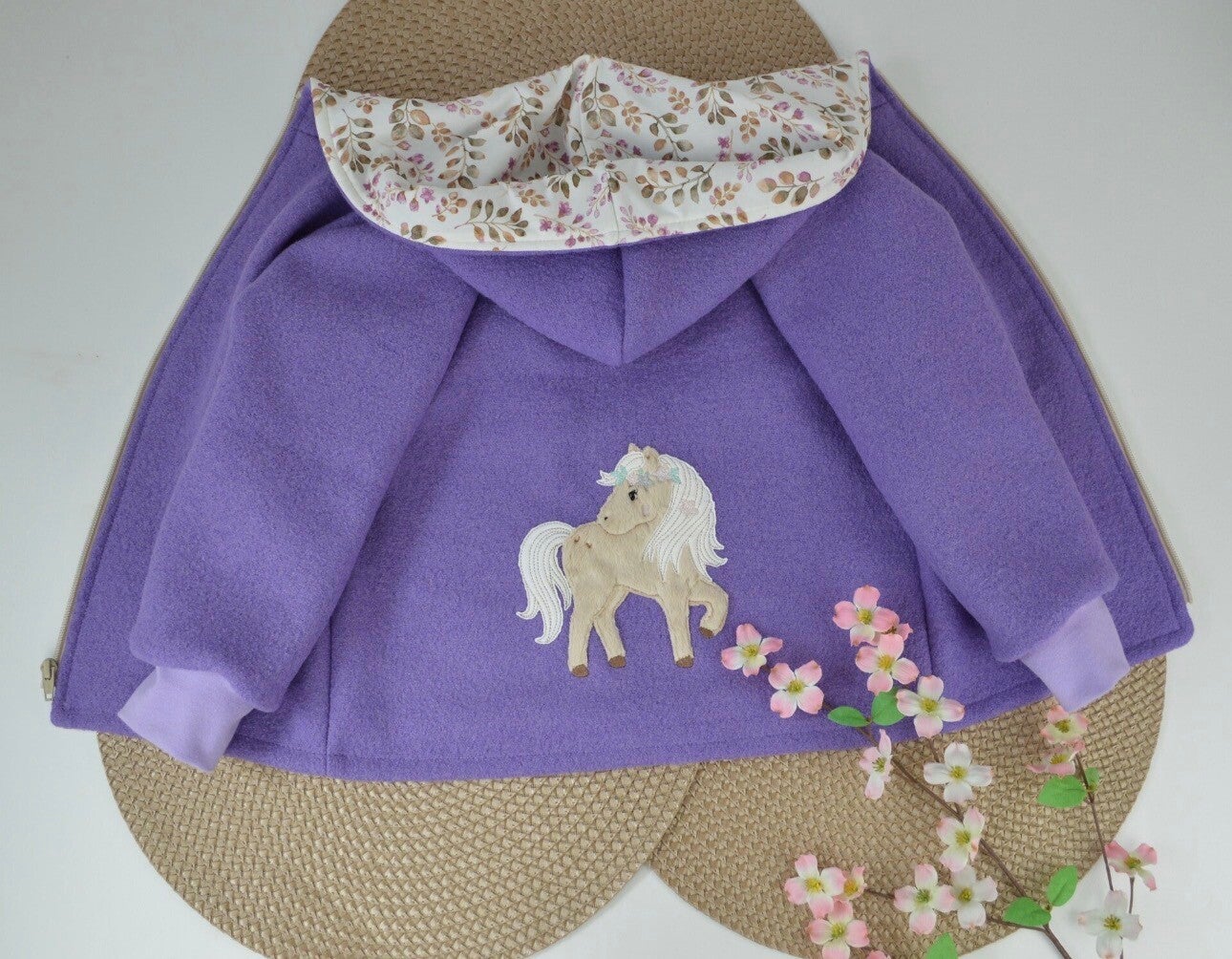 Die Walkjacke lässt sich vorne wahlweise mit Kokosknöpfen oder einem Reißverschluss schließen. Die Knopflöcher werden mit einer Einlage verstärkt, so dass sie NICHT ausleiern und lange schön bleiben. Eine süße Applikation macht die Jacke zu einem echten Hingucker.