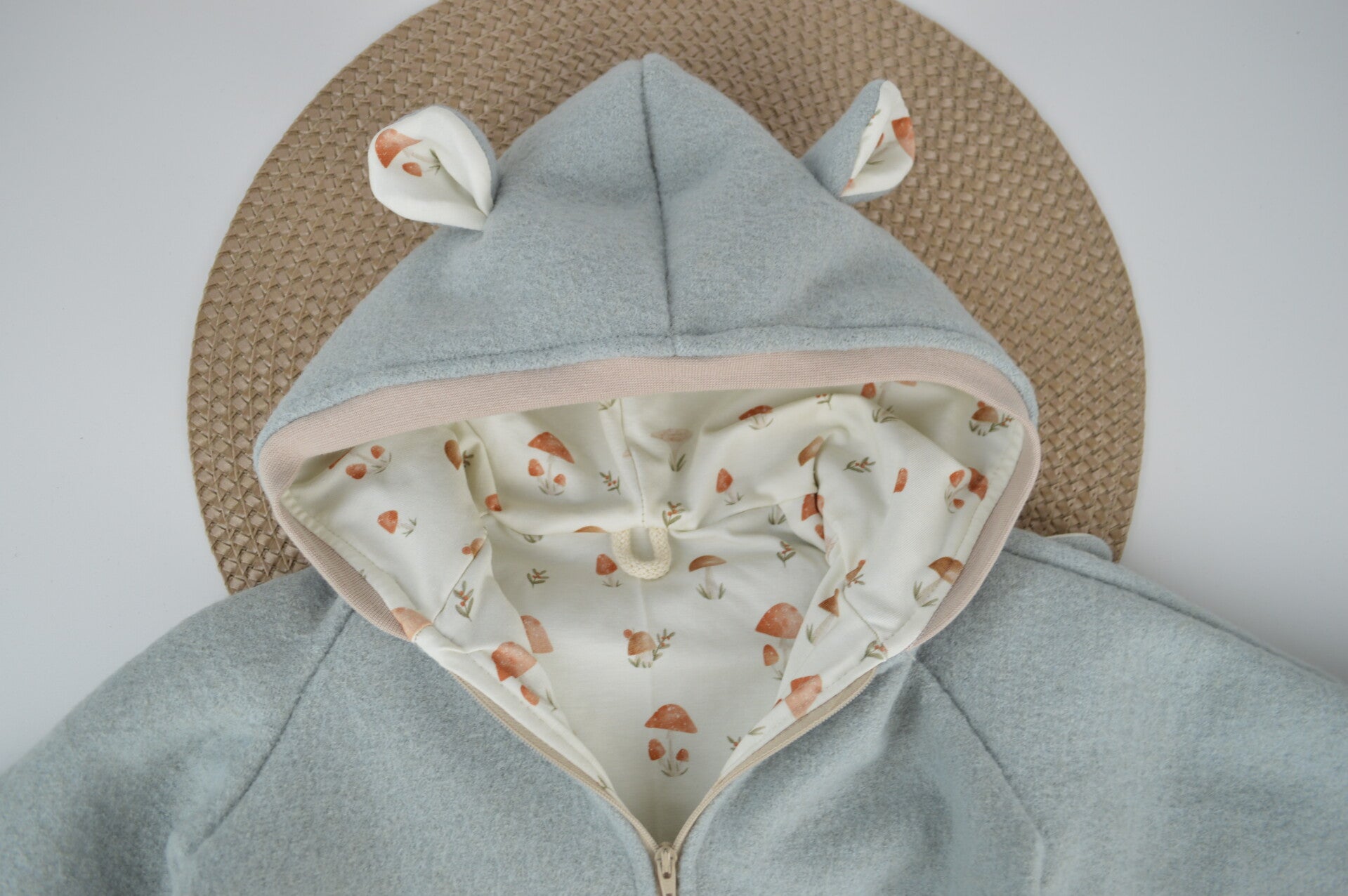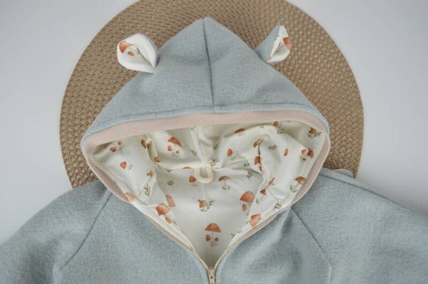 Ein durchgehender Reißverschluss vorn sorgt für einfaches An- und Ausziehen. Die Umschlagbündchen an Armen und Beinen bieten Schutz bei Kälte. Optional können Öhrchen oder eine Paspel an der Kapue ausgewählt werden.