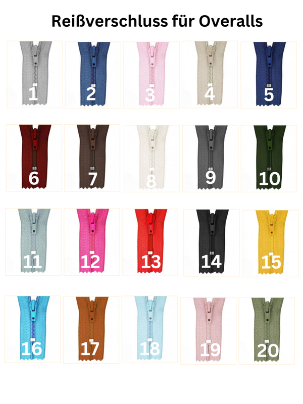 Nr. 1-20 sind die Reißverschlussfarben, Nr. 21. Kokosknöpfe