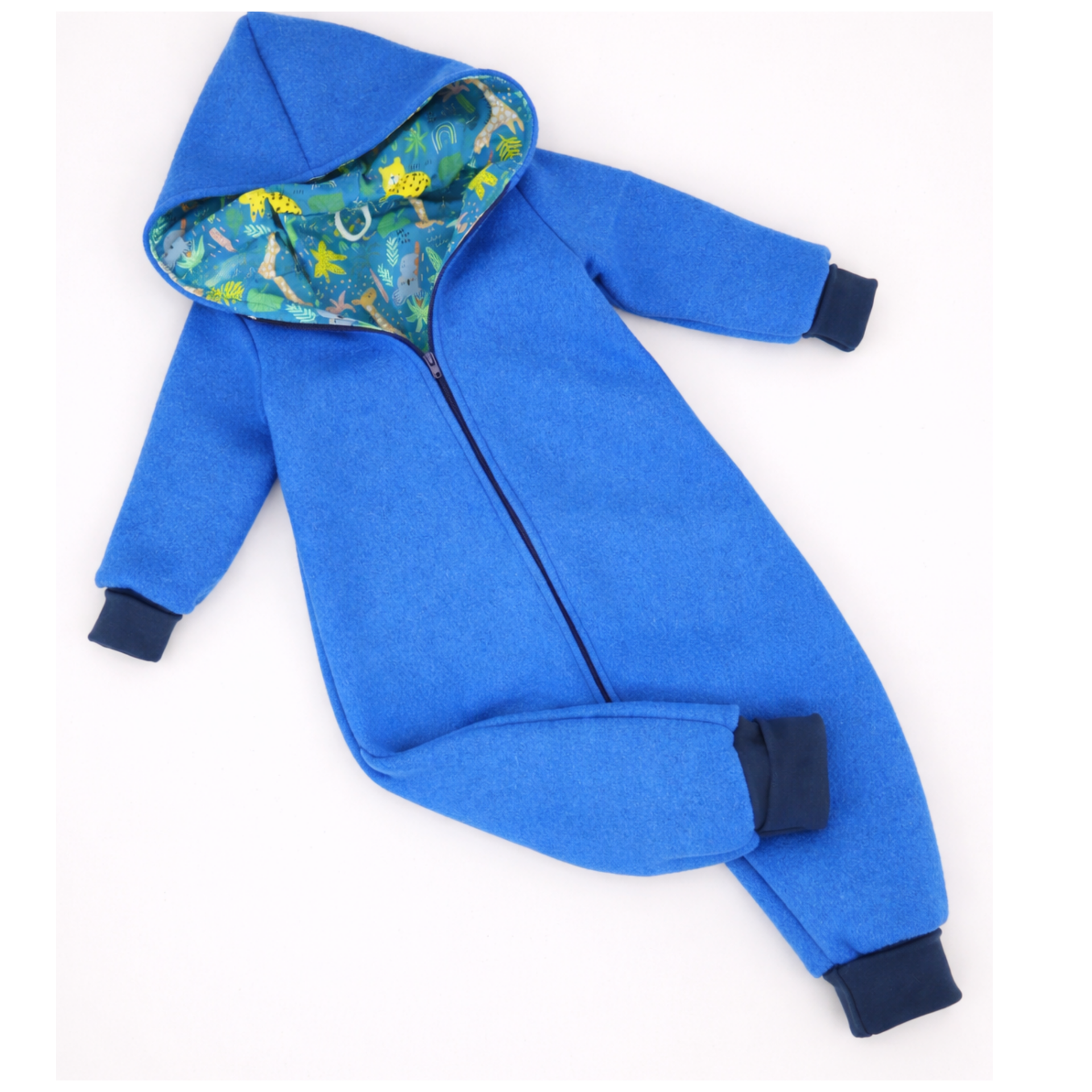 Der Overall besteht aus 100 % temperaturausgleichender Schurwolle (mulesingfrei) und ist innen komplett mit weichem Baumwolljersey gefüttert. Das macht ihn besonders kuschelig, warm und angenehm zu tragen – auch bei kühlerem Wetter zwischen –10 °C und +15 °C.