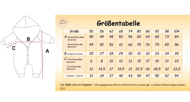 Ein durchgehender Reißverschluss vorn sorgt für einfaches An- und Ausziehen. Die extra langen Mitwachsbündchen an Armen und Beinen bieten bequemen Halt, schließen gegen Zugluft ab und ermöglichen eine längere Tragedauer – der Walkoverall wächst mindestens eine Größe mit!