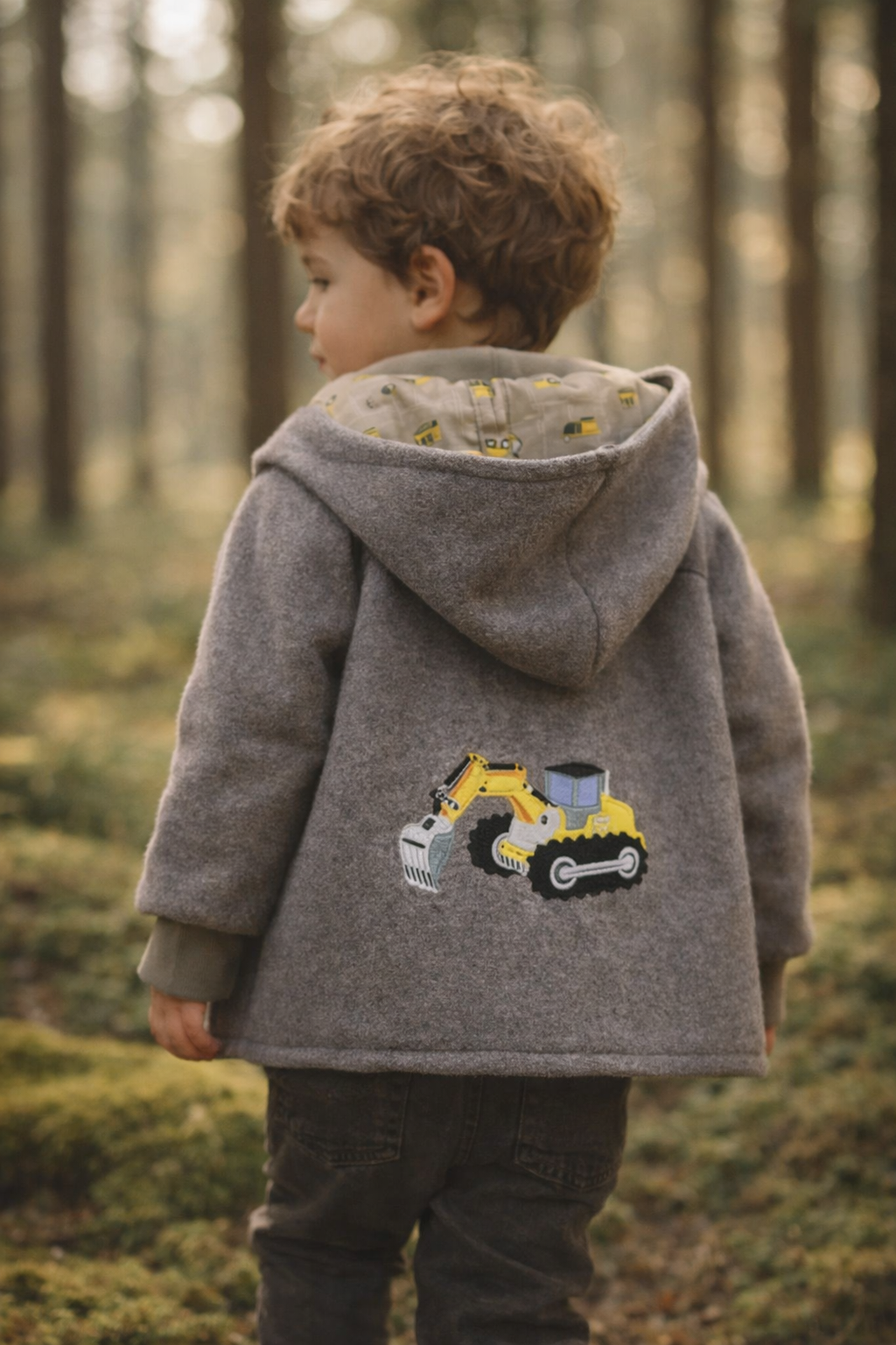 Walkstoff taupegrau/ Innenstoff Baumaschinen/ Bündchen taupe / Bestickung auf Rückenteil Bagger